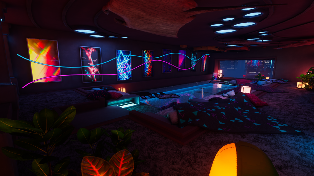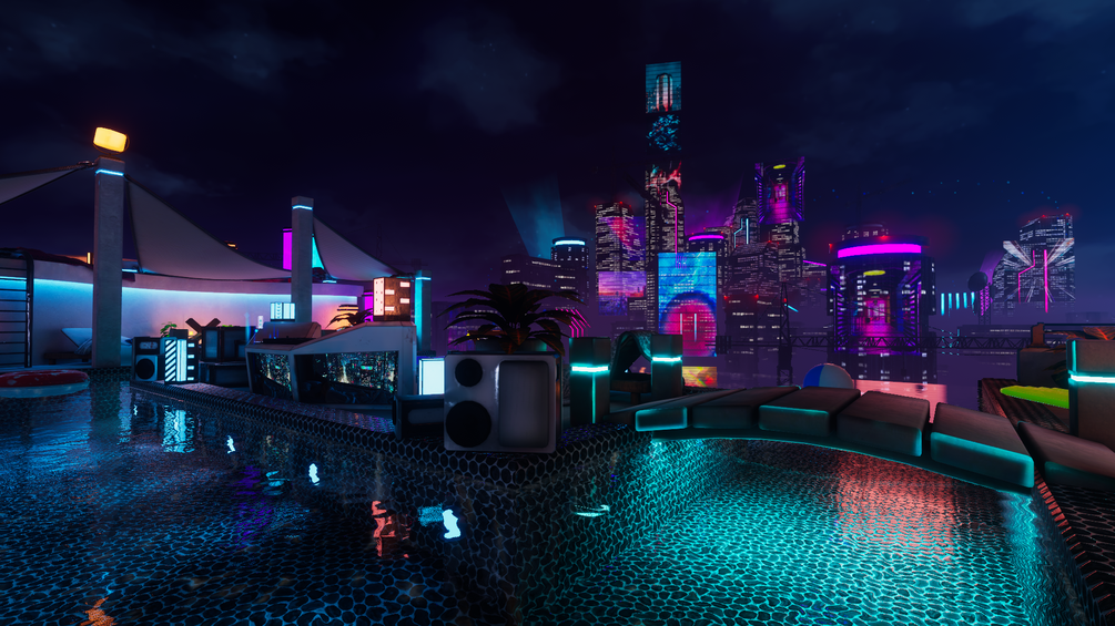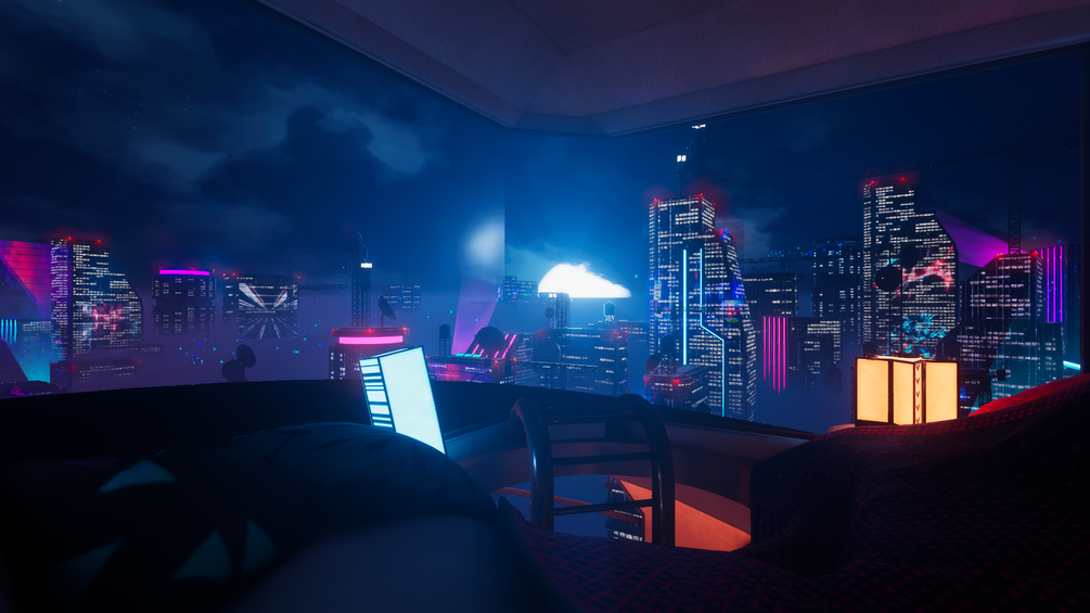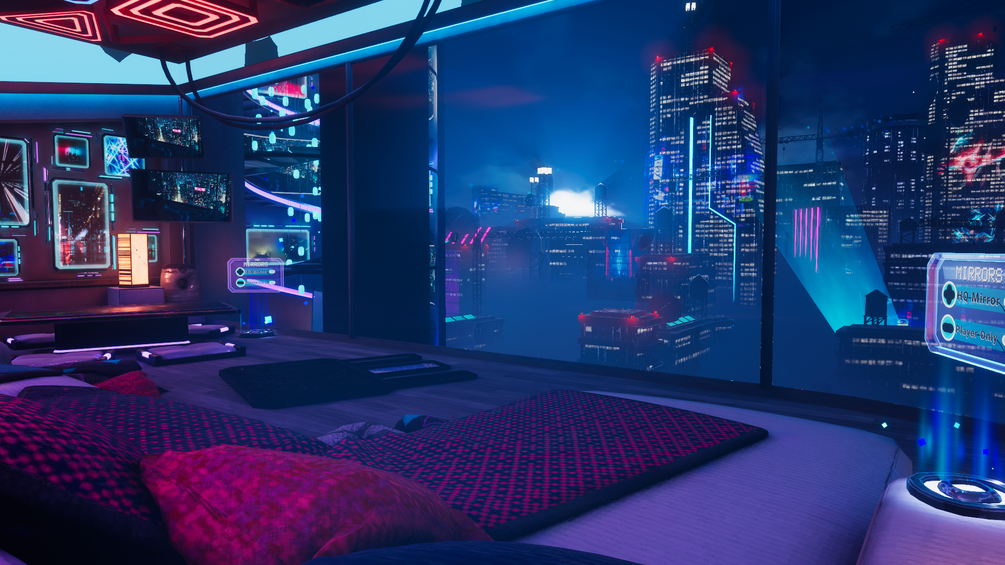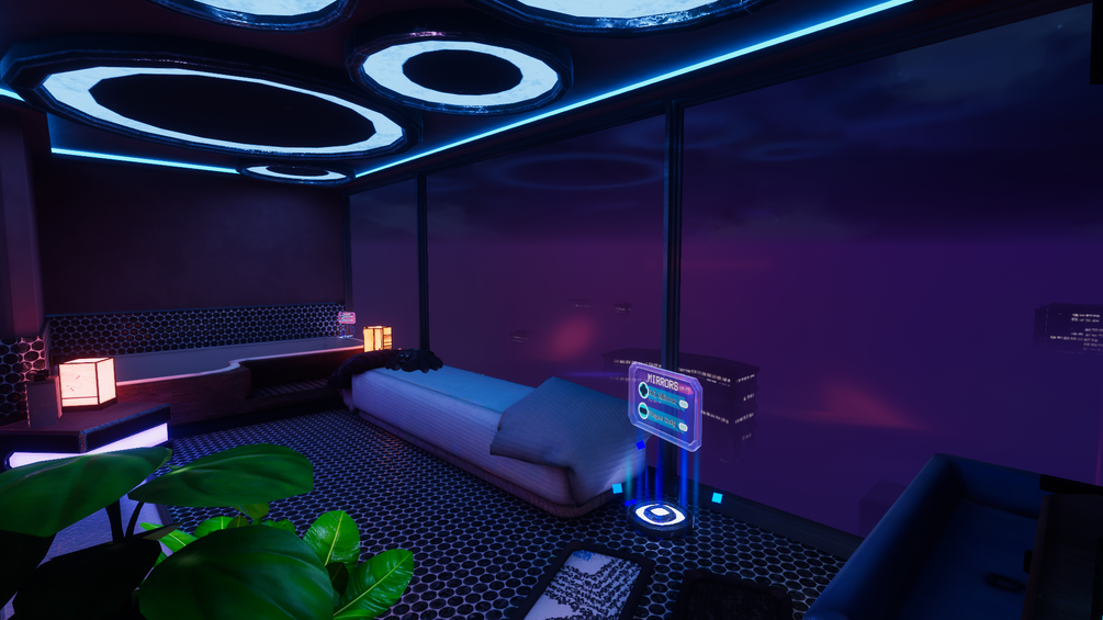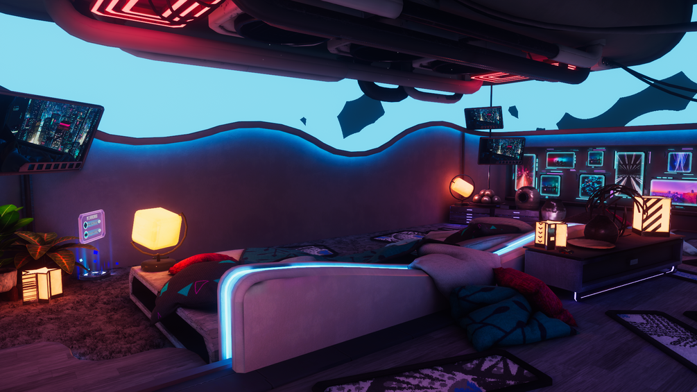 After Glow is your very own top floor cyberpunk apartment! With tons of different comfy areas to vibe with ur homies and photo frames for you to put your memories in!